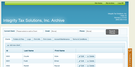 After you register, as the firm administrator, you can begin adding clients to your access list. The client is automatically emailed a link inviting them to register with TrustedTransfer’s website and establish his or her account. The client can then return to TrustedTransfer at any time to upload files, making them available to you and your partners, or view and retrieve existing documents. Your firm can add, edit and delete files from each client’s folder as well, allowing your client to have a secure location to view his or her final engagement documents.